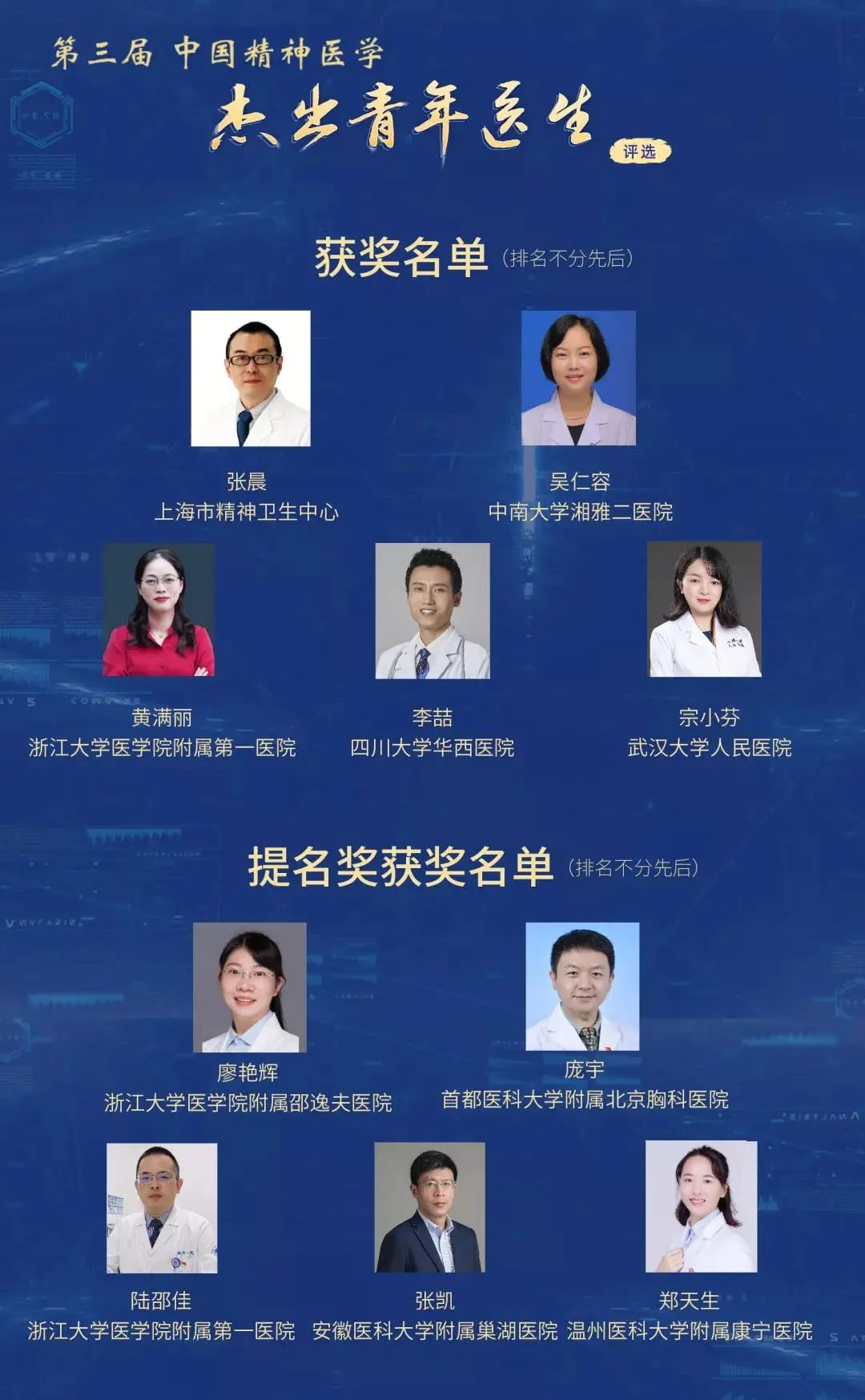 此外,由金界娱乐城 主办、金界娱乐城官方网站附属康宁医院承办的第三届“中国精神医学杰出青年医生评选”评选结果也在会上正式揭晓。张晨、吴仁容、黄满丽、李喆、宗小芬获得第三届“中国精神医学杰出青年医生”称号,廖艳辉、庞宇、陆邵佳、张凯、郑天生获得提名奖,他们以卓然的专业能力、创新精神以及对职业的热爱之情,成为了中国精神医学行业青年医生的表率。