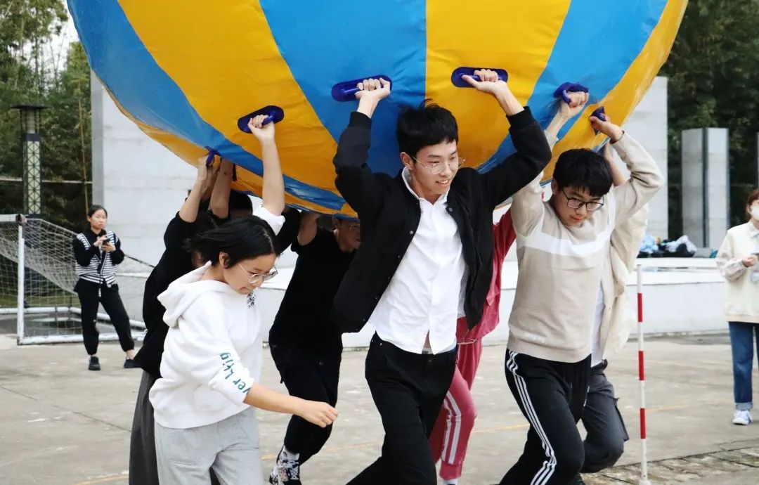 如果说“击鼓颠球”需要的是运动员的准确与克制,“运转乾坤”所需要的力量与速度则更为纯粹。此项目要求运动员们托举着几人高的橡胶气球跑过一个往返,速度快且节奏统一者获胜。各班运动员们在此项目上都表现出了令人印象深刻的协作能力,团结一致的步调让路过的同学都为之惊叹。