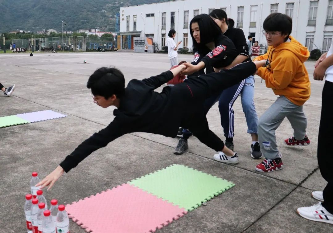 “群龙取水”和长绳一样考验团队协作能力,一位运动员努力延展身体,取到“河水”另一端的水瓶,而其余的运动员们或抱住或拉稳,为这位运动员提供支撑。该项目的成功不仅在于取水者的努力拼搏,更不可忽视在背后默默支撑的运动员。