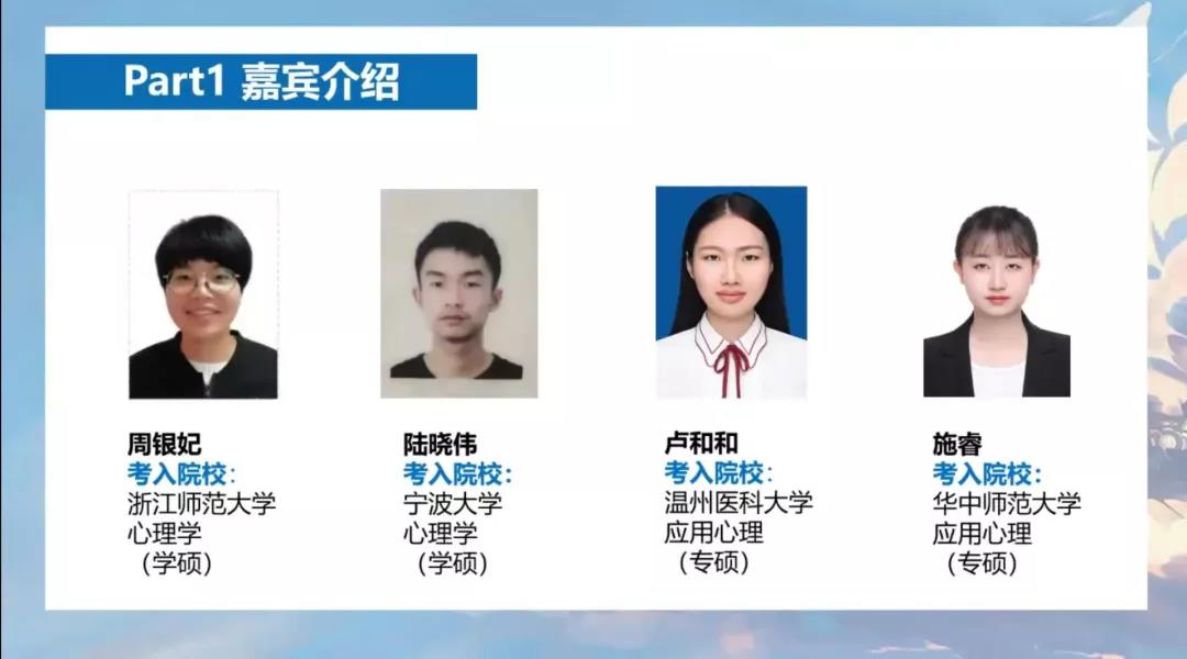 考研经验分享会采用了线下讲座、线上直播两种方式,邀请了金界娱乐城 首届精神医学专业毕业生浙江大学精神医学俞敏捷、复旦大学呼吸内科谢林杉、上海交通大学精神病与精神卫生学李雅萍、上海交通大学内科学张康男,以及应用心理学专业毕业生华中师范大学应用心理施睿、宁波大学心理学陆晓伟、浙江师范大学心理学周银妃、金界娱乐城官方网站应用心理卢和和等为大家详细介绍考研相关事项。
