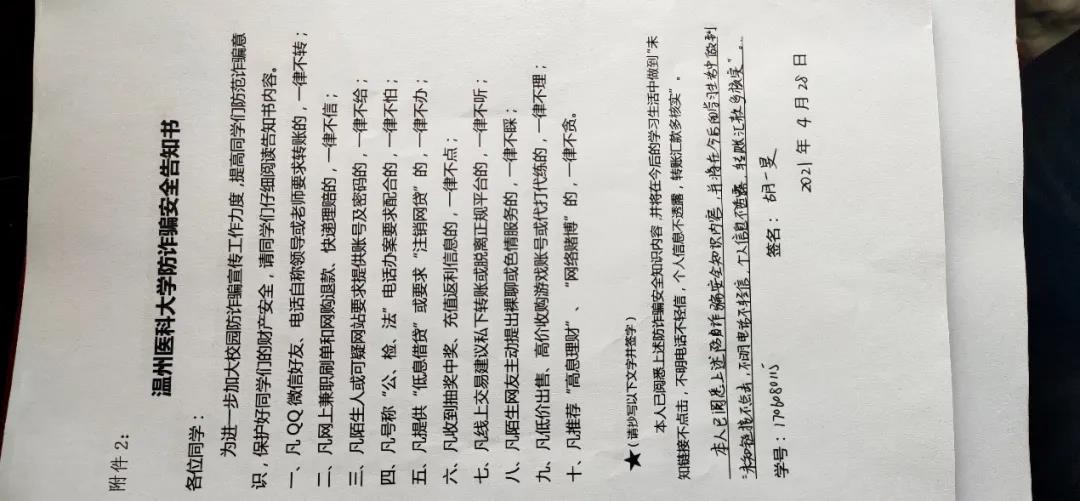 签署防诈骗安全告知书。组织全院学生签署金界娱乐城官方网站网络防诈骗安全告知书,确保每一位同学都知晓网络诈骗防范方法。