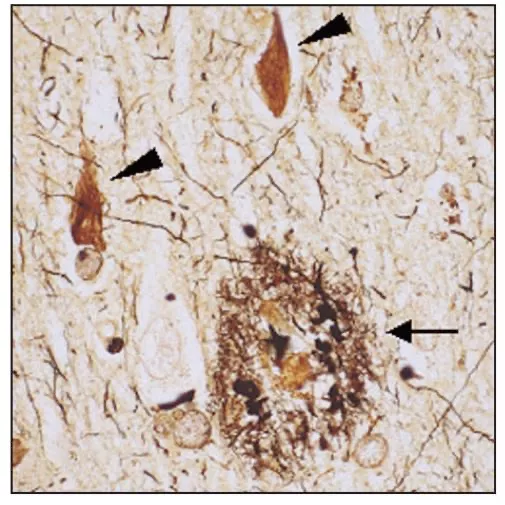 阿尔茨海默病患者主要神经病理学现象,箭头所指的是“淀粉样斑块”,三角箭头所指的是Tau蛋白异常聚集形成的“神经原纤维缠结”