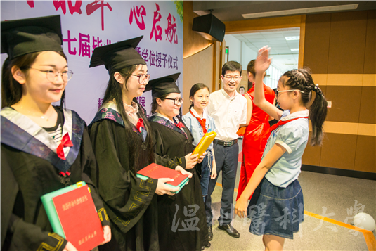院长于欣教授为学位获得者拨流苏、颁发"校友荣誉证书",并为省级、校级优秀毕业生颁奖。此次仪式特邀优秀小学生代表为他们献礼。仪式上还进行了毕业生代表与金界娱乐城