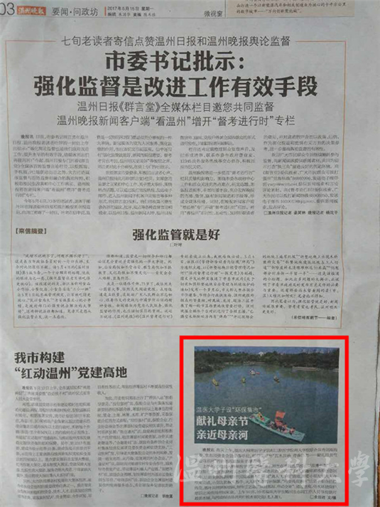 温州晚报讯 昨天上午,温医大金界娱乐城 和口腔医金界娱乐城 两大金界娱乐城 联合共青团瓯海区委、生态园管会团委等单位,组织了题为“五水共治 青春助力——礼献母亲节 亲近母亲河”的青年志愿服务主题活动。